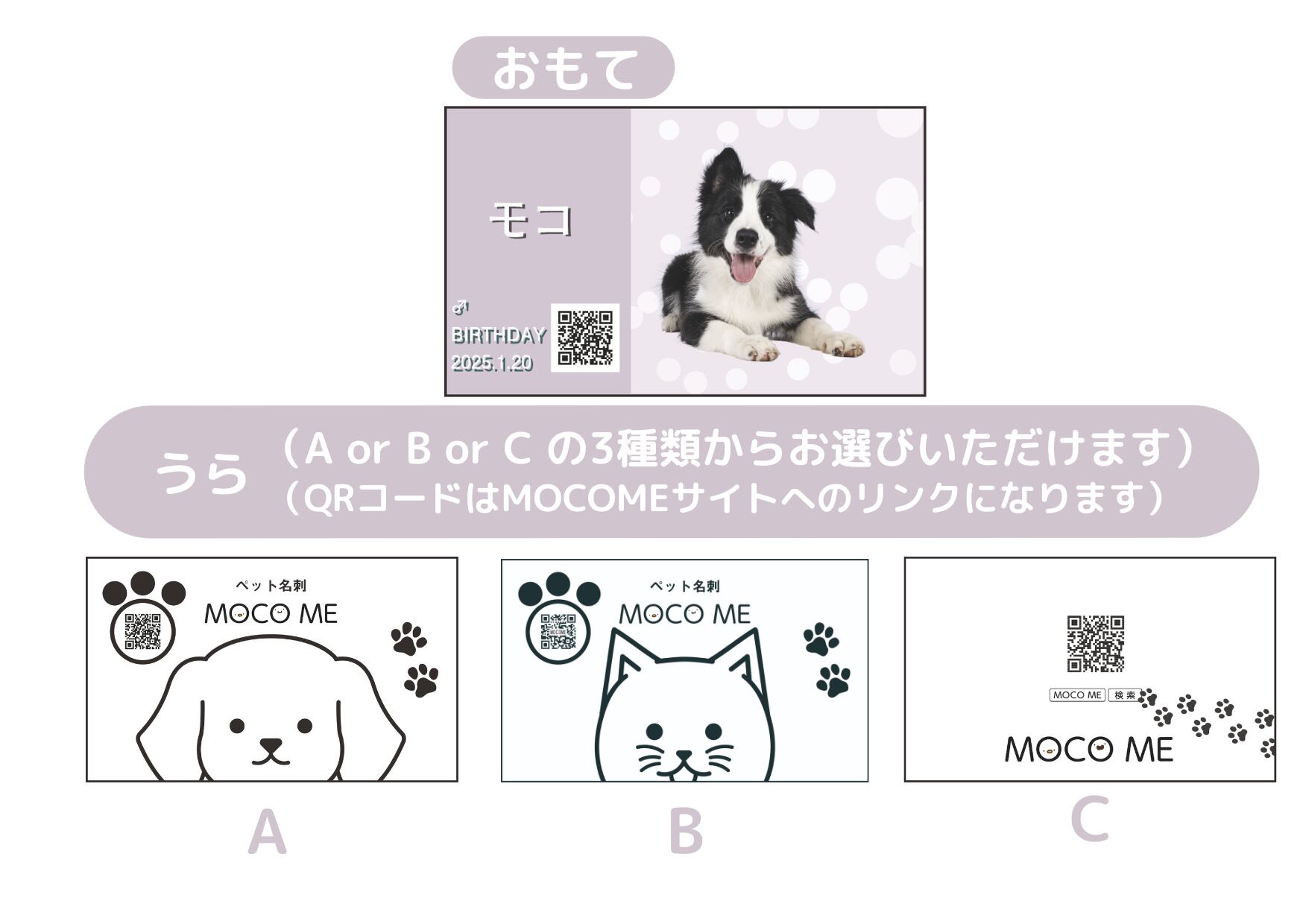 裏面にMOCO ME広告をお入れした両面印刷になります。片面印刷よりも税込550円お安くご購入いただけます。裏面のデザインは、AかBのどちらかをお選びください。