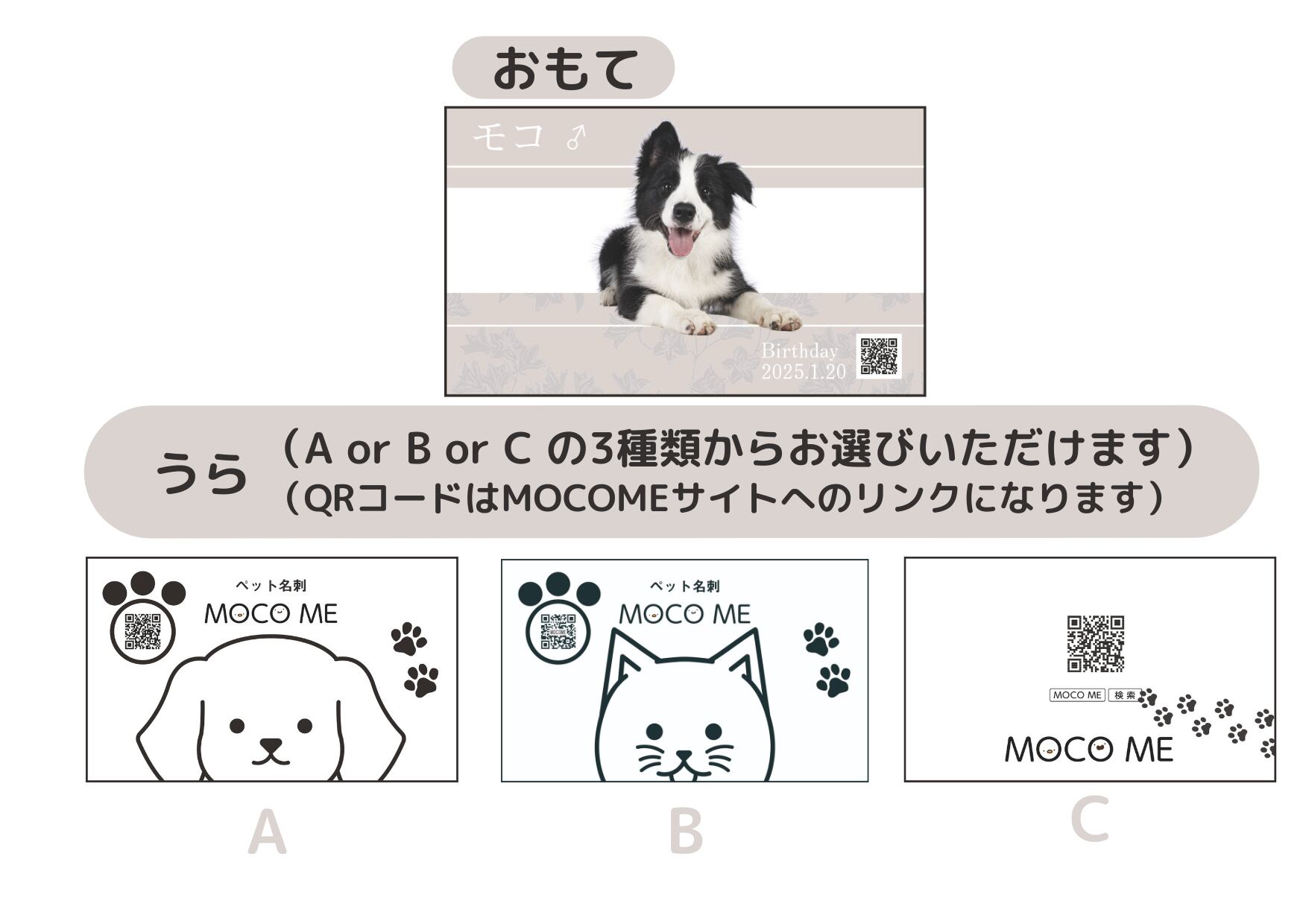 裏面にMOCO ME広告をお入れした両面印刷になります。片面印刷よりも税込550円お安くご購入いただけます。裏面のデザインは、AかBのどちらかをお選びください。
