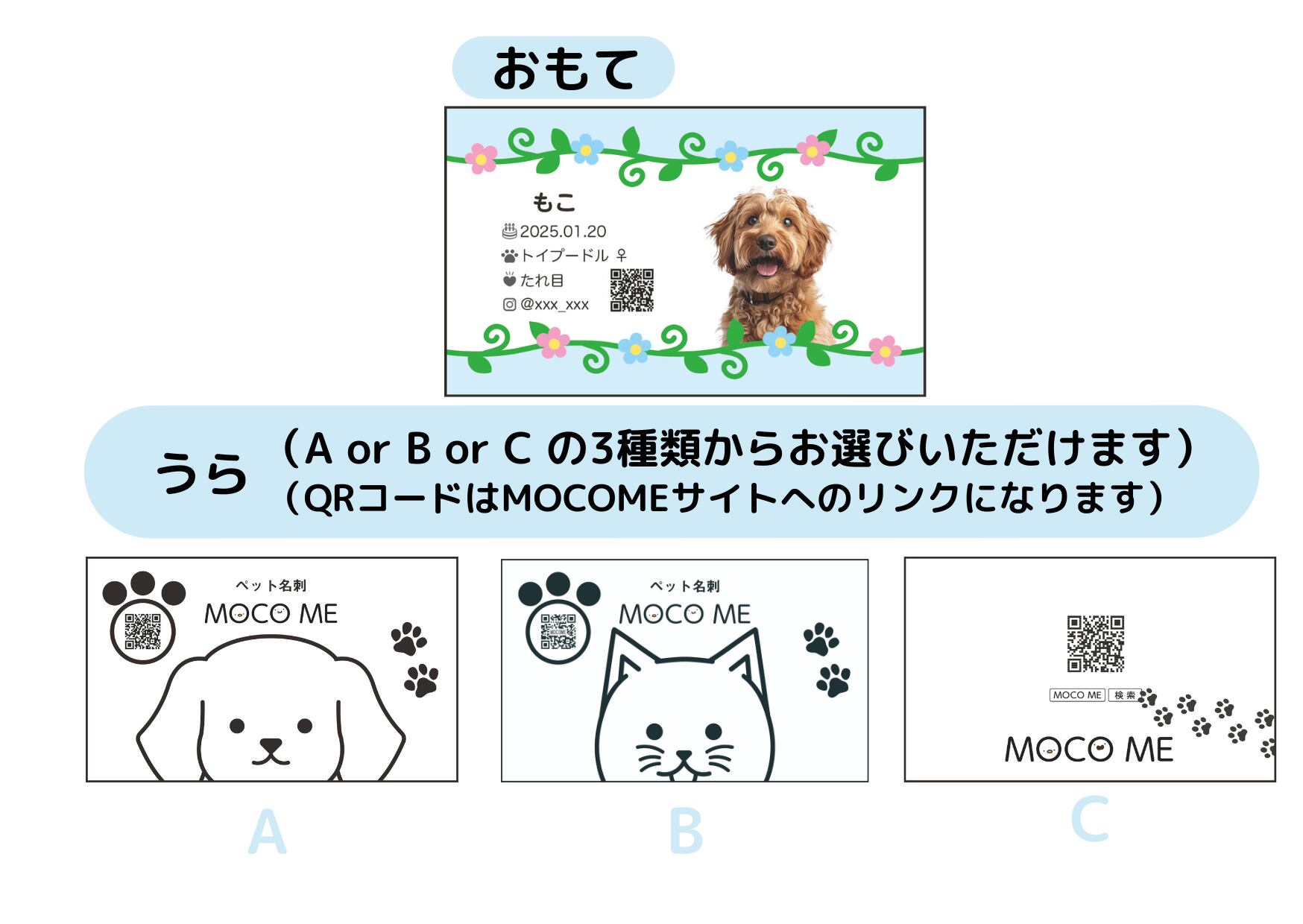 裏面にMOCO ME広告をお入れした両面印刷になります。片面印刷よりも税込550円お安くご購入いただけます。裏面のデザインは、AかBのどちらかをお選びください。