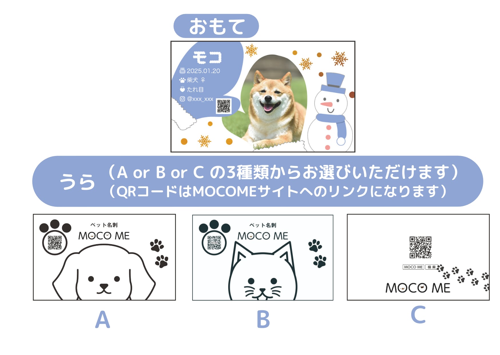 裏面にMOCO ME広告をお入れした両面印刷になります。片面印刷よりも税込550円お安くご購入いただけます。裏面のデザインは、AかBのどちらかをお選びください。