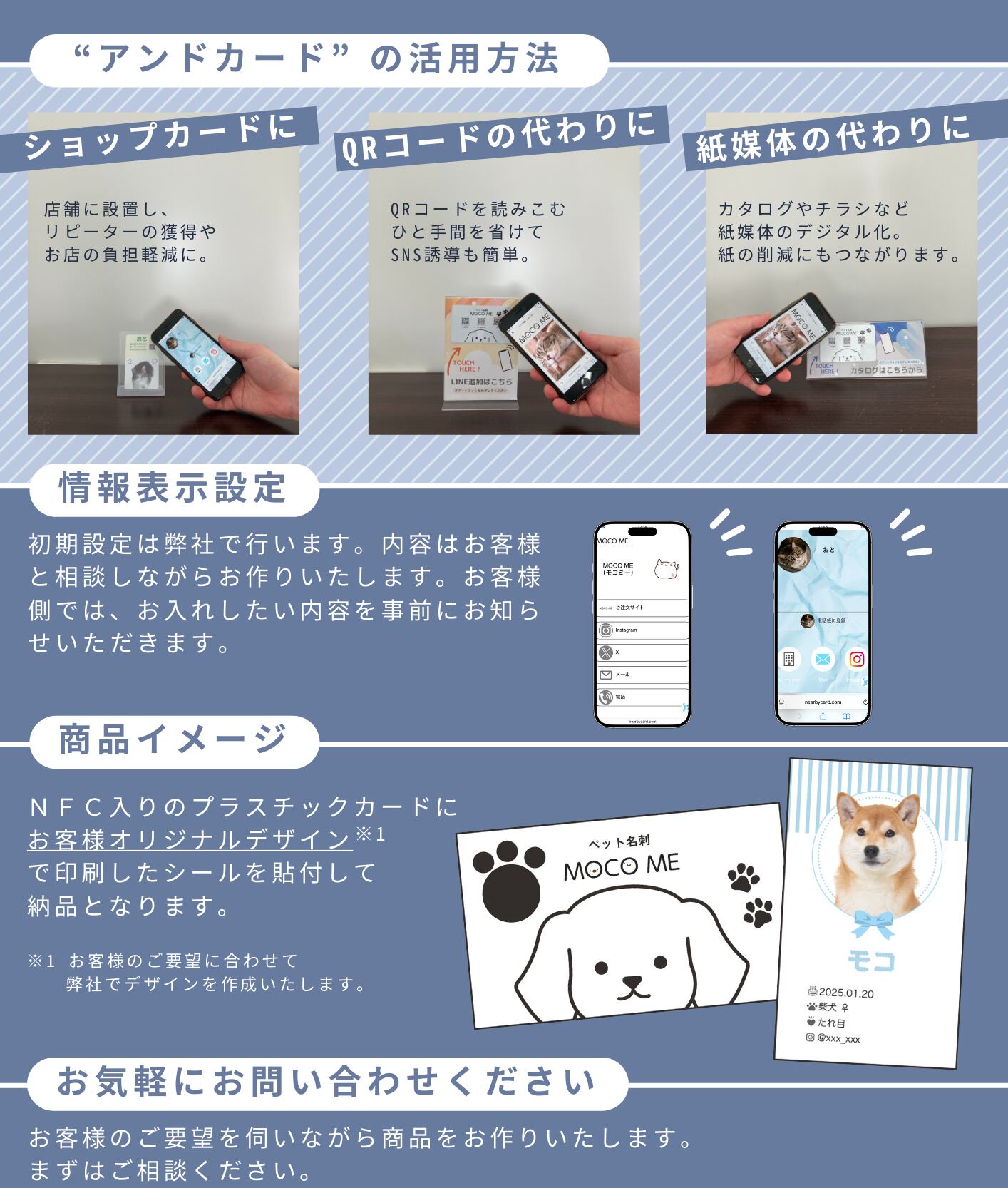 NFC入りのプラスチックカードに、お客様オリジナルデザインを貼付して納品となります。