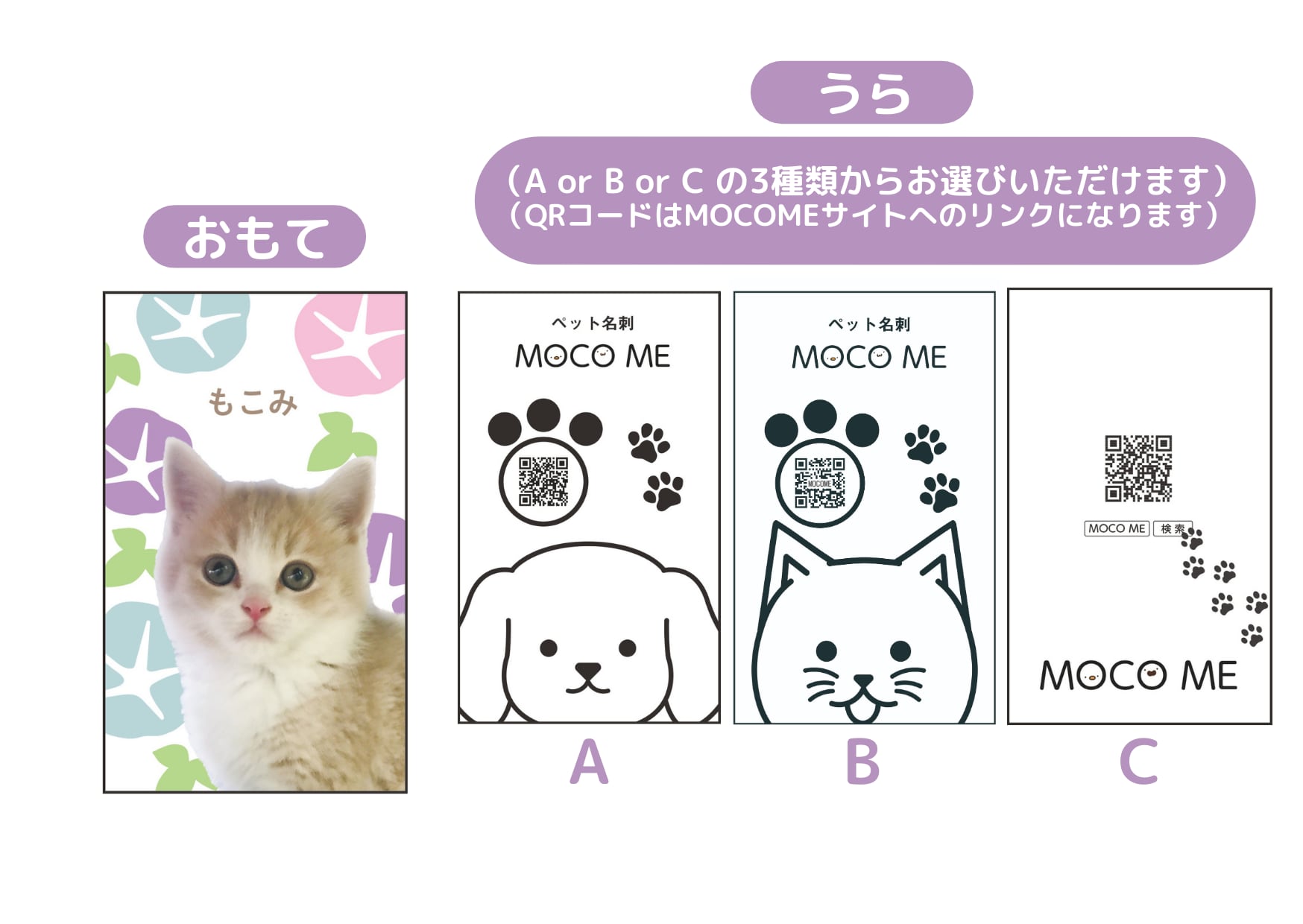 裏面にMOCO ME広告をお入れした両面印刷になります。片面印刷よりも税込550円お安くご購入いただけます。裏面のデザインは、AかBのどちらかをお選びください。